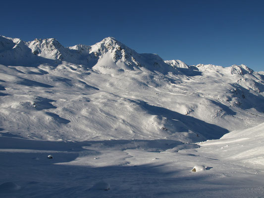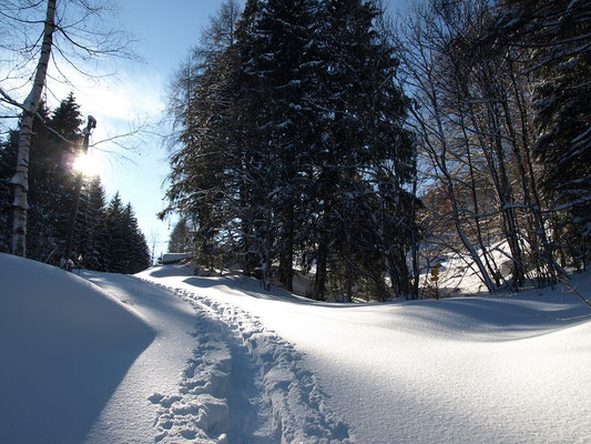 Am zweiten Tag ziehen wir unsere Spuren nach Lust und Laune weiter hinauf, vielleicht auf den Cuolmet, vielleicht auf eine andere namenlose Erhebung mitten in der weissen Weite, und geniessen einfach diese prächtige Winterbergwelt. Der Abstieg erfolgt über die Alp Crap Ner, durch schöne Waldschneisen bis hinunter ins Dorf Sumvitg, vielleicht noch mit einem Abstecher zur Caplutta Sogn Benedetg. Die aus Holz und Holzschindeln von Peter und Annalisa Zumthor gebaute Kapelle vermittelt mit dem speziellen, von oben einfallenden Licht eine besinnliche Stimmung.